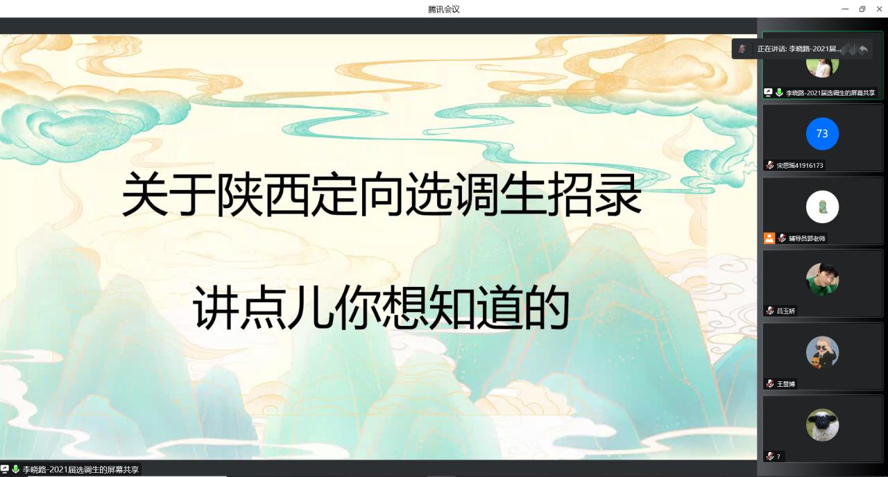 首先,吴乐从选调生的定义与国家选调生工作的关键节点出发介绍了选调生的“前世今生”。随后,吴乐围绕着选调生的分类、报考的资格条件、选调生录取比例、选调生的优势和待遇、选调生与公务员的区别等内容深入分析,建议同学们结合自身条件积极报考选调生。最后,吴乐向同学们详细介绍了考试时间、考试内容、2021年陕西省内笔试情况等内容,建议同学们尽早确定目标,积极备考。紧接着,张媚从三个方面介绍了选调生的相关内容,包括对选调生的认识、选调生基本政策、选调生考试的重点方法梳理。她鼓励同学们要及时关注国家政策、善于整合资源、多做前期准备,做到目标笃定、坚持不懈、执着努力。