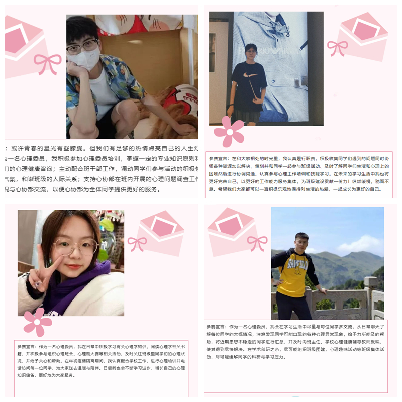 为进一步落实心理健康教育工作体系,加强老员工的心理适应能力,培育员工自尊自信、理性平和、阳光向上的积极心态,增进心理育人宣传的实效。结合党委学工部(武装部、员工处)《关于开展公司第七届“阳光护航”心理育人宣传季实践活动通知》的相关要求,公司积极创新活动形式,丰富活动内容,在公司领导的大力支持和全体师生的共同努力下,面向公司全体员工开展了心理主题班会、心灵信箱、“十佳”心理委员评选、主题征文和视频Vlog大赛、大白墩墩逛校园、心理情景剧大赛等系列心理育人宣传季系列活动。