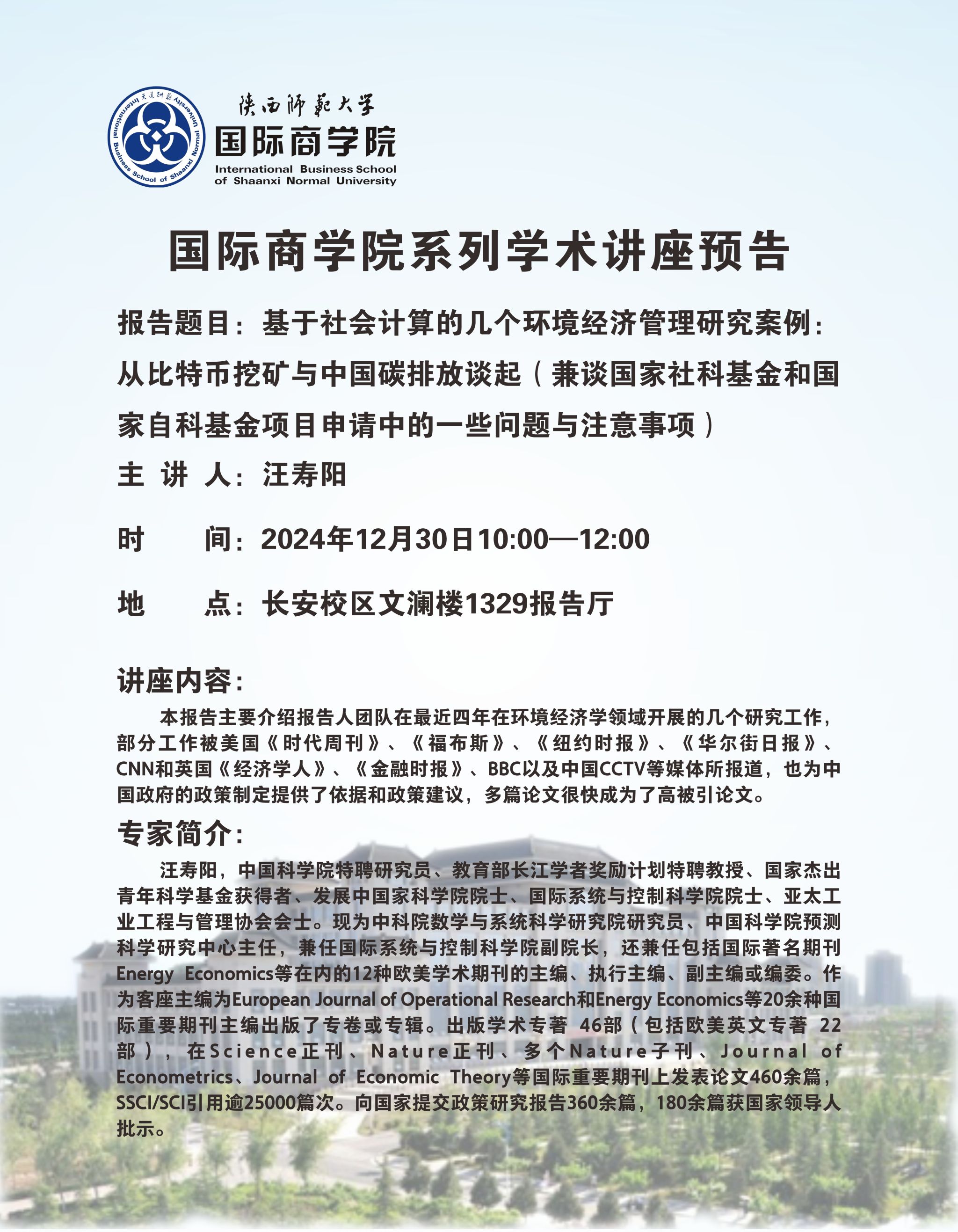 学术讲座预告——基于社会计算的几个环境经济管理研究案例:从比特币挖矿与中国碳排放谈起(兼谈国家社科基金和国家自科基金项目申请中的一些问题与注意事项)