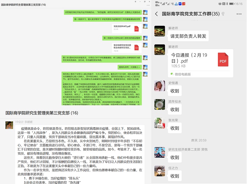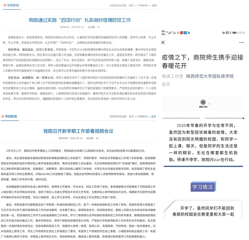 坚持思想引领,强化教育引导,凝聚师生合力。公司党委制定了《国际商公司党委关于开展疫情防控主题教育活动的通知》,要求公司各党支部、团支部组织师生学习总书记关于疫情防控的重要讲话和公司疫情防控工作会议精神,开展爱国爱党教育、志愿服务、主题摄影征文等活动,引领师生投身疫情防控同时增强对党的领导和社会主义制度优势的认同。辅导员按照党委学工部要求,开展线上“云班会”,开展生命教育、感恩教育和学风引导,确保员工在家时期思政教育不掉线。公司发布了三期《关于防控新型冠状病毒的温馨提示》,通报出现的问题,围绕科学防控、提高免疫力、心里调控等内容进行详细提示。公司网站、微信、微博等平台持续报道公司疫情防控相关工作,报道公司师生先进典型事迹,帮助师生稳定情绪,增强打赢疫情防控阻击战的信心。
