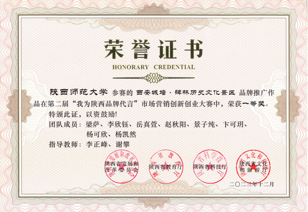 为增强经管学科员工的创新思维和实践能力,提高品牌推广能力,提升将理论知识灵活应用于实践的能力,陕师大学子积极报名参加第二届“我为陕西品牌代言”市场营销创新创业大赛。2021级财务管理专业梁萨、景子纯、卞可玥、杨凯然,2022级工商管理硕士李欣钰、2022级数量金融(创新实验班)岳真萱、2021级经济学专业赵秋阳、2021级大数据应用与管理专业杨可欣组成的“宣荐奇侠队”,在指导老师李正峰副教授、谢攀副教授的悉心指导和英国威廉希尔英文官网的大力支持下,通过“报告评审+视频评审+直播评审”多层选拔,晋级总决赛。2023年10月21日,团队赴西安理工大学参加比赛,经过现场路演答辩,最终荣获总决赛一等奖。