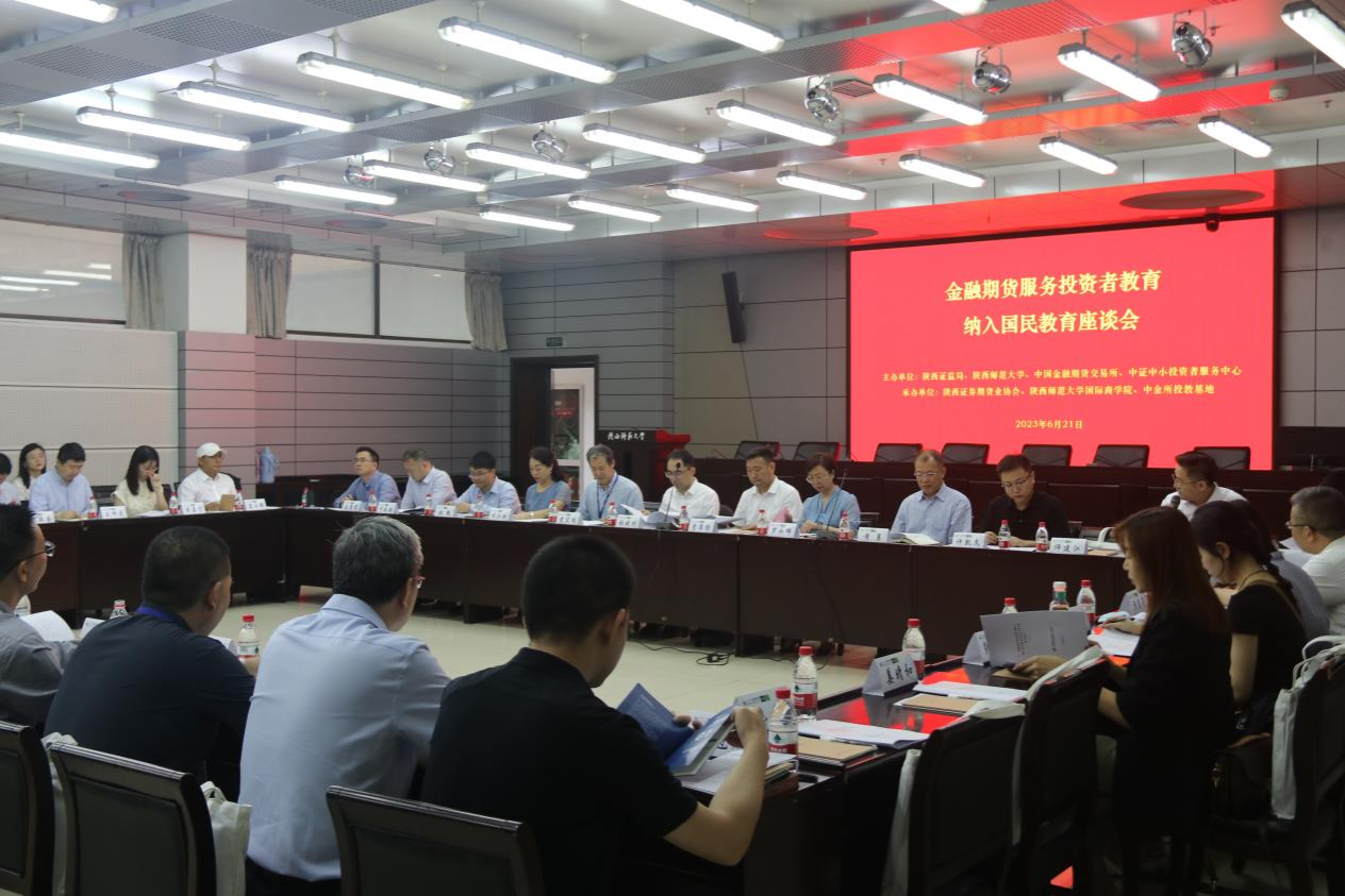6月21日上午由陕西证监局、威廉希尔williamhill官方网站、中国金融期货交易所、中证中小投资者服务中心主办,陕西证券期货业协会、英国威廉希尔英文官网、中金所投教基地承办的“金融期货服务投资者教育纳入国民教育座谈会”在威廉希尔williamhill官方网站召开。陕西证监局党委委员、副局长曹淮扬,陕西证券期货业协会秘书长任江虹,中证中小投资者服务中心党委副书记、总经理黄勇,中国金融期货交易所党委副书记、总经理张晓刚,威廉希尔williamhill官方网站党委副书记罗永辉,威廉希尔williamhill官方网站国际商公司党委书记思培峰,经理雷宏振,副经理尹海员以及省内外高校相关学科负责人、机构代表共40余人参加本次座谈会。