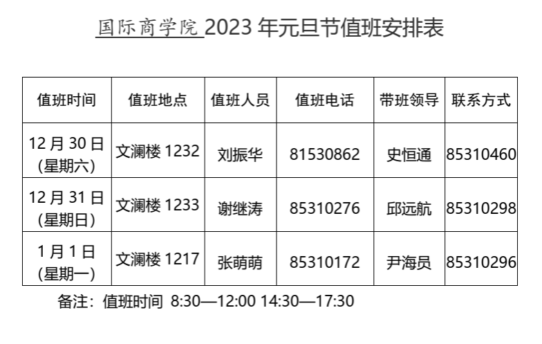 2023年元旦值班安排表
