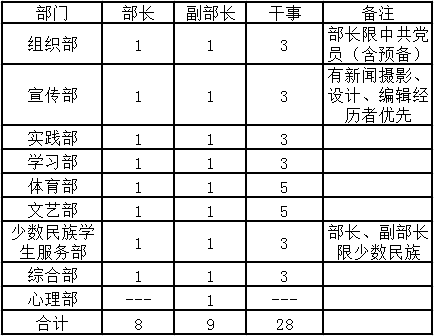 1.各年级做好此次竞聘大会的宣传动员工作,督促参选者按时提交相关材料;
