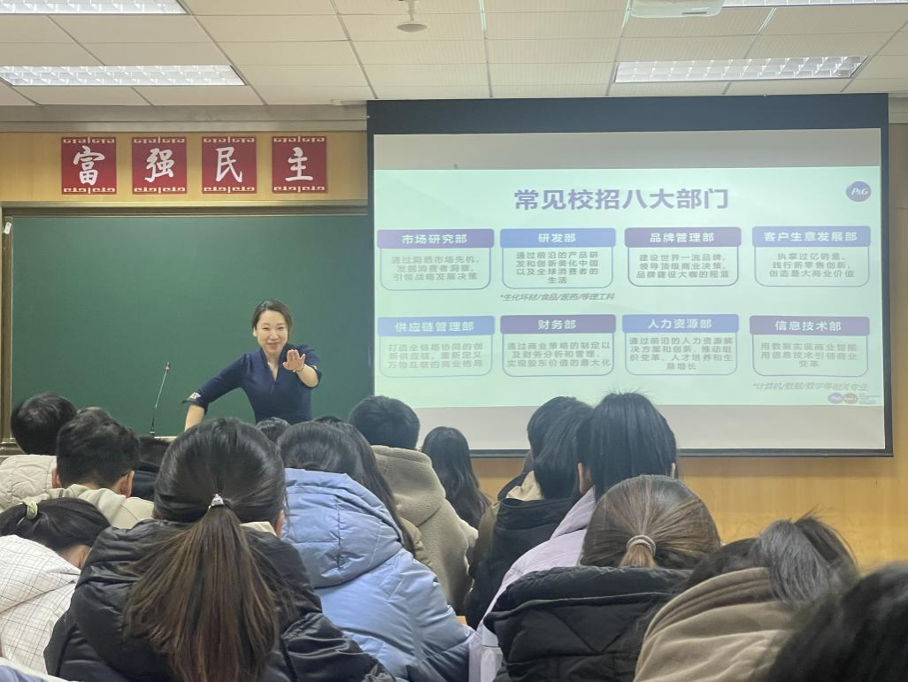 2023年12月20日,“快消行业就业与职场经验”为主题的第三期“精英课堂”顺利举行。宝洁全域零售渠道销售总监杜倩,从快消品行业特征与前景,宝洁人才与发展策略和自身职场经验,让同学们了解快消品行业,为同学们未来的就业方向提供更多的可能。并为同学们提出了一些发展建议,加速学习、转变自身为自己的职业发展负责。